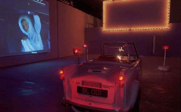 Georgina Starr – Bunny Lake Drive-In. The Bunny Lake Drive-in forms the third part of the Bunny Lake trilogy. As with earlier works by Starr, it finds it’s references in film and the interplay between fiction and reality. In this case, the work is partly inspired by two films of the sixties, Bunny Lake Is Missing (Otto Preminger, 1965) and Peter Bogdanovich’s Targets (1967). For this major installation, Starr reconstructs a drive-in cinema complete with a customised open top car, listening posts and 3 large scale projections.