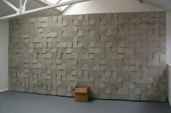 Ryan Gander’s Your Clumsiness is the Next Man’s Stealth is composed of an accumulation of seemingly disparate components. On the floor of a moderately bare gallery sits a cardboard box, placed without any particular motive. The box contains double-sided tourist maps of the City of Sheffield. At first glance these maps seem to be the type freely distributed by Sheffield City Council to assist tourists in navigating the city and finding suitable accommodation. In actuality, however, they are flawless reproductions with the exception of a handful of newly added streets. These new streets are taken from maps made around 1810 and although they did once actually exist, they have since been erased from the city’s landscape to make way for large Modernist municipal buildings, as well as new post-war ring roads and roundabouts.One wall of the exhibition space has been clad in what appears to be a patterned concrete relief, akin to what one would usually expect to find on the walls beneath a motorway underpass or on the exterior side of a civic building perhaps designed and built around the 70’s. It is in fact made from fibreglass and coloured and textured to look like a concrete cast. The wall not only exists as a backdrop for a sound piece that encompasses the room, but also as a stage or a set onto which a narrative can unfold. As a reconstruction of a facade; this fortification could not be more artificial.