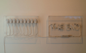 Tony Kemplen’s commissioned work The End refers to the date which has been calculated as the end of the world. Scientists believe the world will end 1000000000000 years from now. Nine domestic light timers in sequence are set to illuminate a sign as the universe expires.