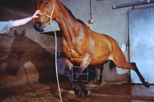 Horses and lens-based media came into conjunction with Eadweard Muybridge’s experimental photographs of a horse at gallop in 1872 which reversed the accepted beliefs about animal locomotion by proving that all four hooves leave the ground at once. These famous images have proved the inspiration for more recent work such as Steven Pippin’s Laundromat Locomotion (Horse and Rider) 1997 which were based around Muybridge’s invention of sequential triggered photographs which prefigured film.