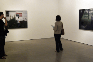 Jen DeNike searches out bucolic locations and local inhabitants to create telling pictures of lost innocence. In a work titled Mike and Kevin, 2006 (above), DeNike captures an ‘ordinary scene’ in rural New York: a clapboard white house adorned with an American flag. Two teenage boys sit out front, it seems like the moment before or after an event. The setting exudes a heartfelt patriotism, except for the upside down flag, seemingly a gesture of opposition but rendered ambiguous by also being layered with the official flag symbolism in which it is a sign of distress, an SOS.