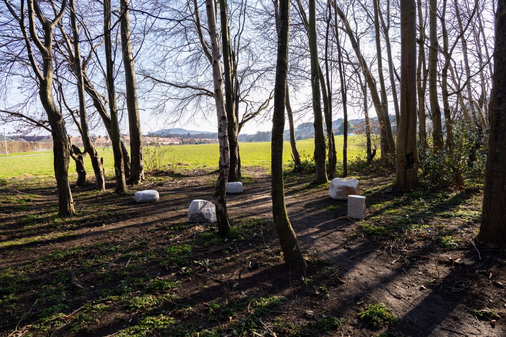 Each of the six site-specific commissions is crafted from fossilised stone – linking this inland area with the nearby marine environments that the track connects with. The works also include elements of soil, wood and seed and are designed to support the health of both the people using the track and the surrounding ecology.
